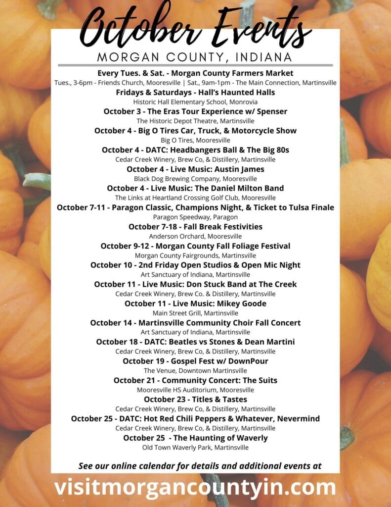 October events include festivals, concerts, Titles & Tastes, and the Haunting of Waverly Oct 10, 2025 For more events in the area, VisitMorganCountyIN.com