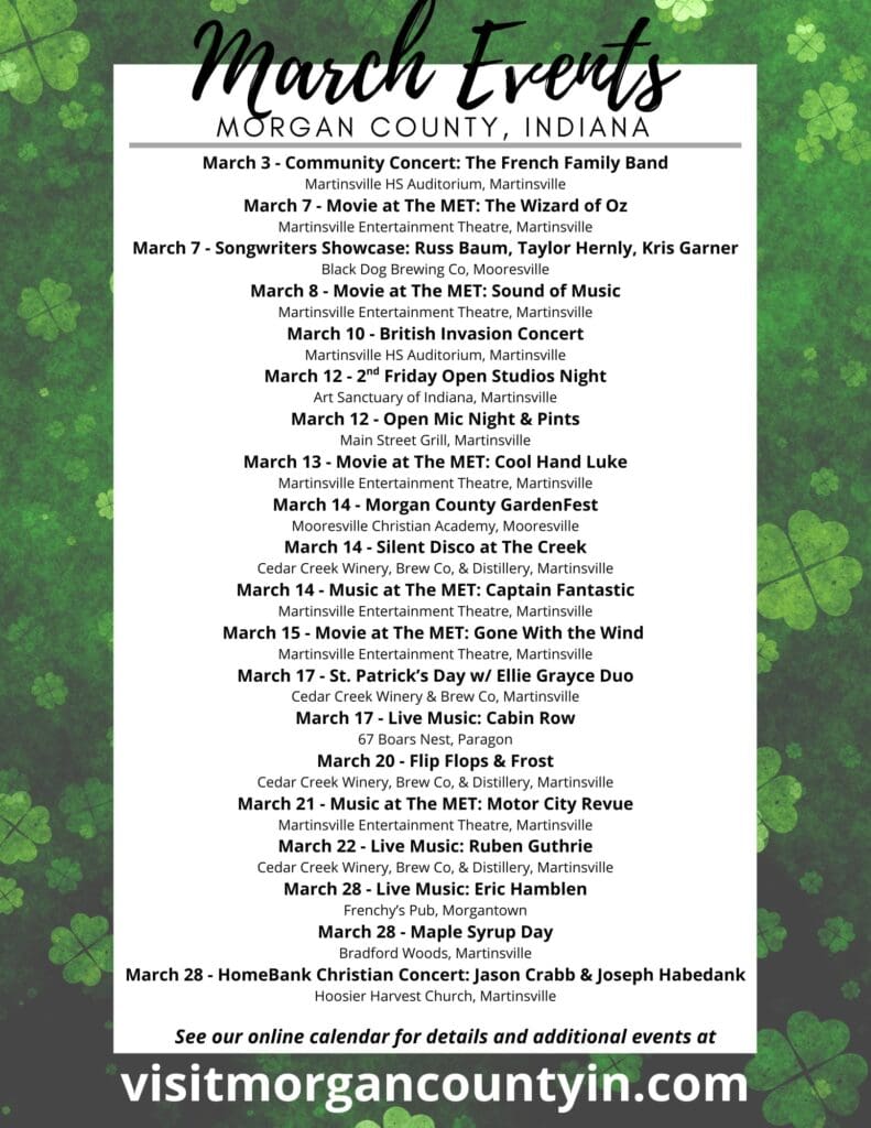 Movies at the MET, live music, purse bingo, and Grease: The Musical – all this month! Feb 2, 2026 For more events in the area, VisitMorganCountyIN.com