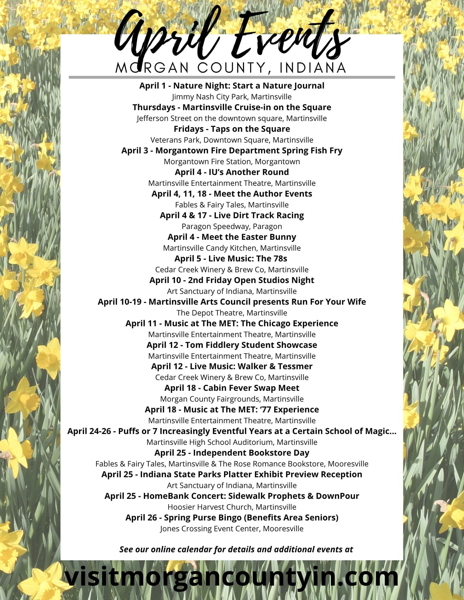 Cabin Fever Swap Meet, Live Music, Student Showcase, and Meet the Author Events – all in April Apr 3, 2026 For more events in the area, VisitMorganCountyIN.com