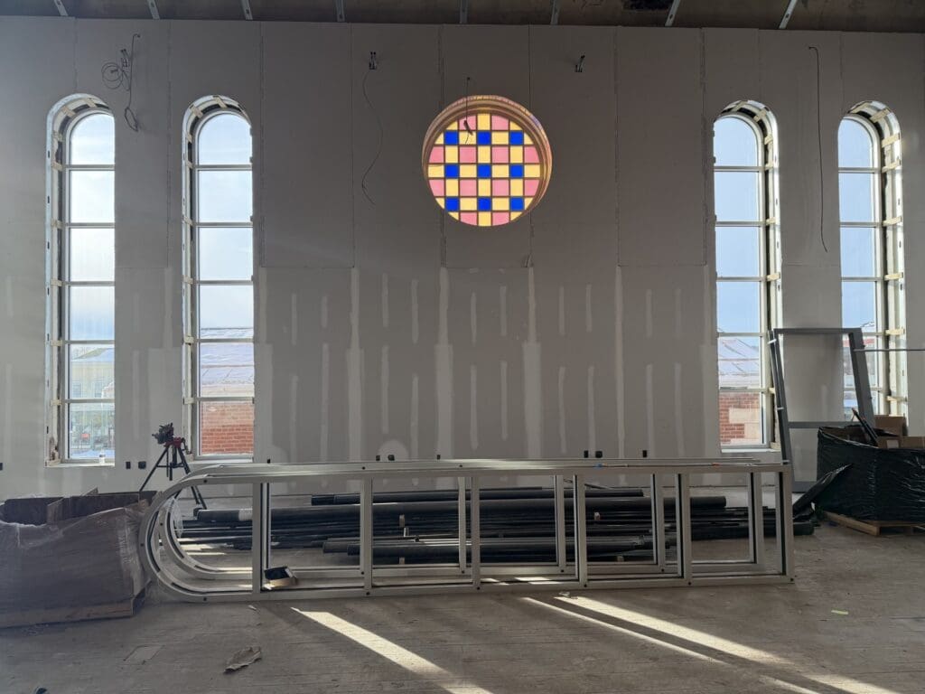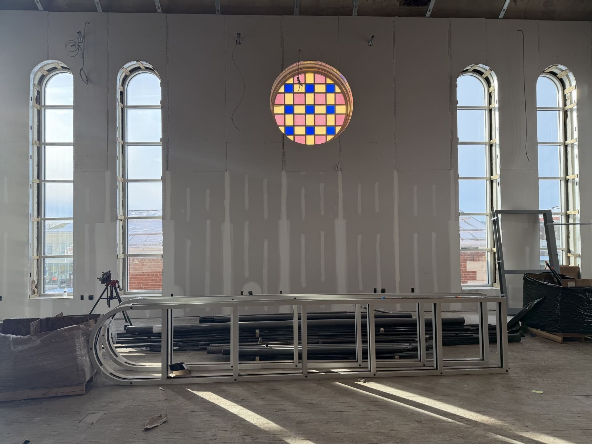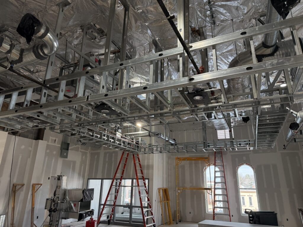 Inside the building, demolition of existing walls, ceilings, floors, and windows is complete. Contractors have been busy on interior work, including framing and drywall, new duct installation, installation of new plumbing piping, and a new fire protection system.