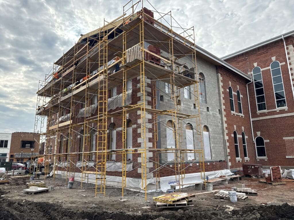 Good progress has been made on the brick and limestone work for the North building addition. They are on track to be completed by the middle of next Month. The existing brick and limestone around the original building were also gently washed this month, which has brightened up the old limestone.