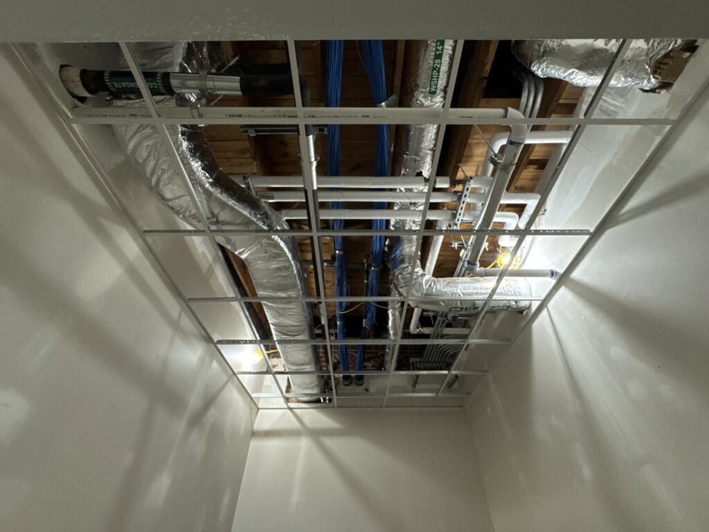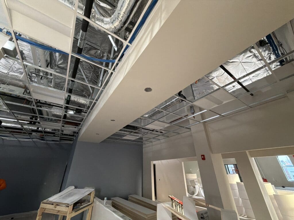 Interior work has continued with the first coat of paint completed on the second floor. Ceiling grid installation has started upstairs, and more finishes will follow. Some upcoming activities include permanent lighting, duct connections to grilles and diffusers, and fire alarm devices. The first floor follows the same sequence and will be closed behind with finishing activities.