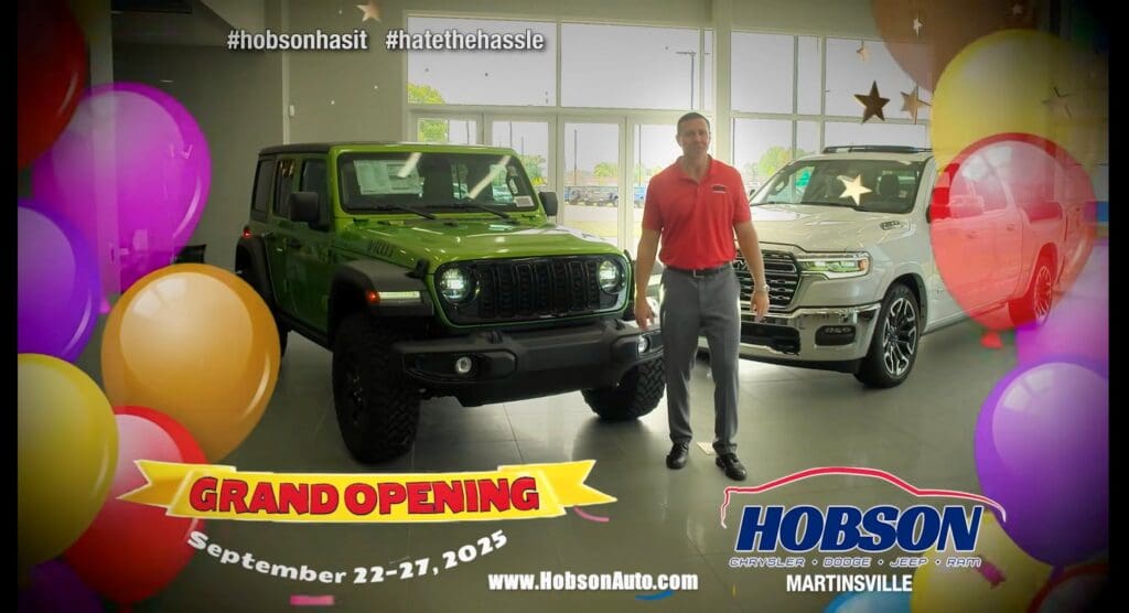 Folks–you’ve waited long enough. It’s finally time to celebrate the Grand Opening of the NEW Hobson Chrysler Dodge Jeep Ram of Martinsville, located at 675 W. Southview Drive!