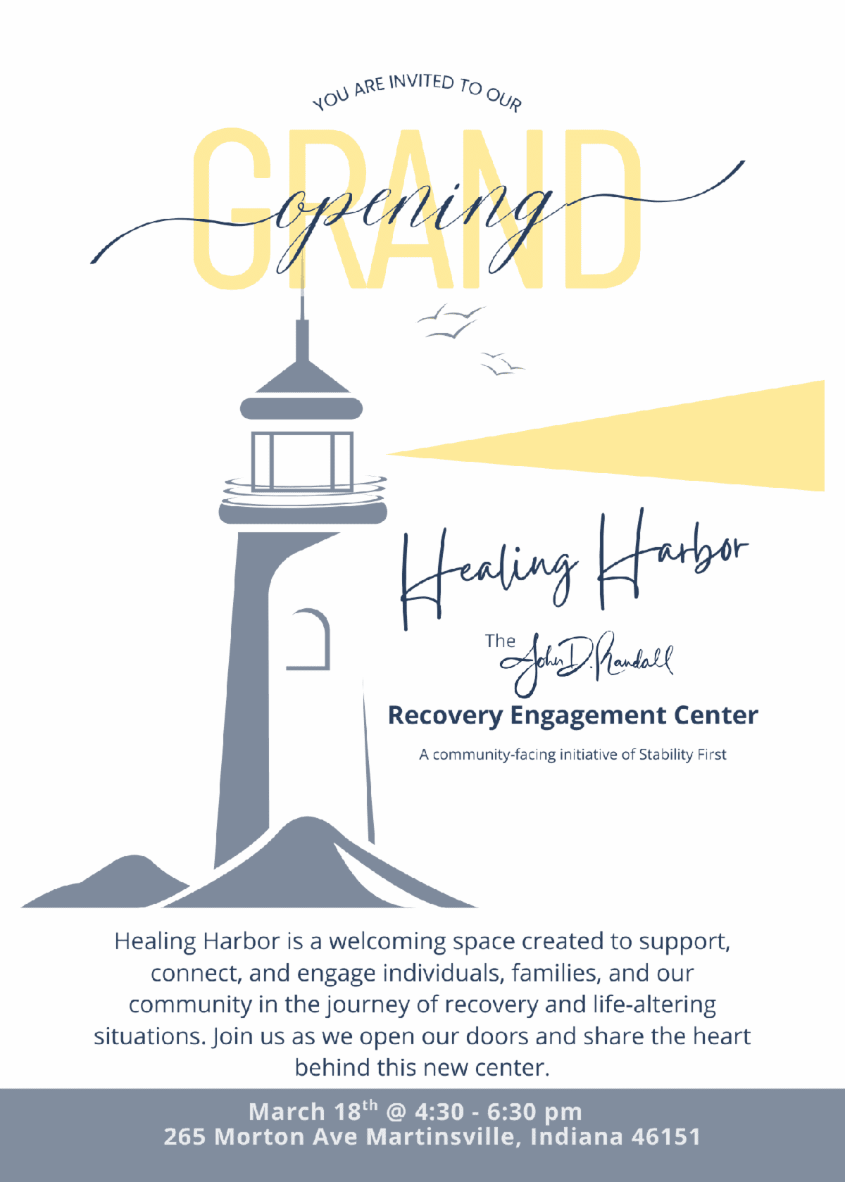We are honored to officially invite you to the Grand Opening of Healing Harbor – The John D. Randall Recovery Engagement Center, a community initiative of Stability First.