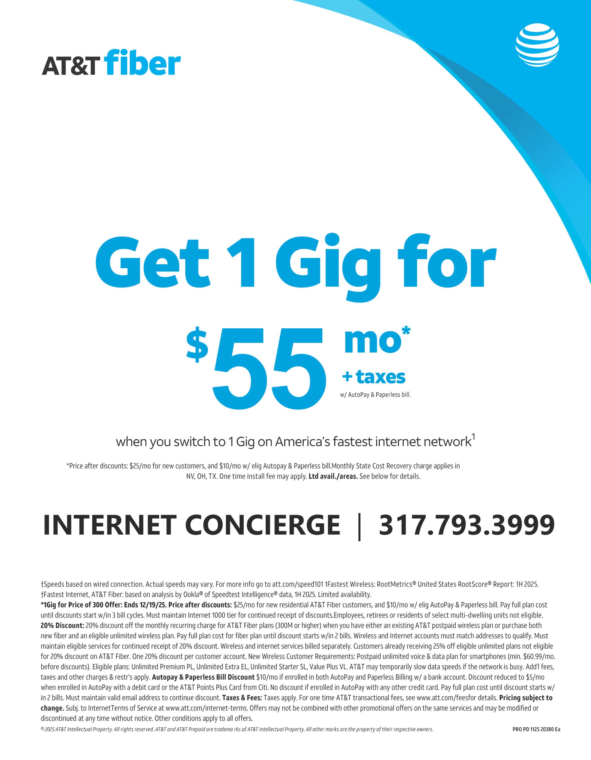 *For a limited time, new residential customers can get AT&T 1Gig symmetrical Fiber speed for the low price of only $55 mo. Contact Marta Thomas at 317.793.3999 for details. Offer expires 12/19/2025.
