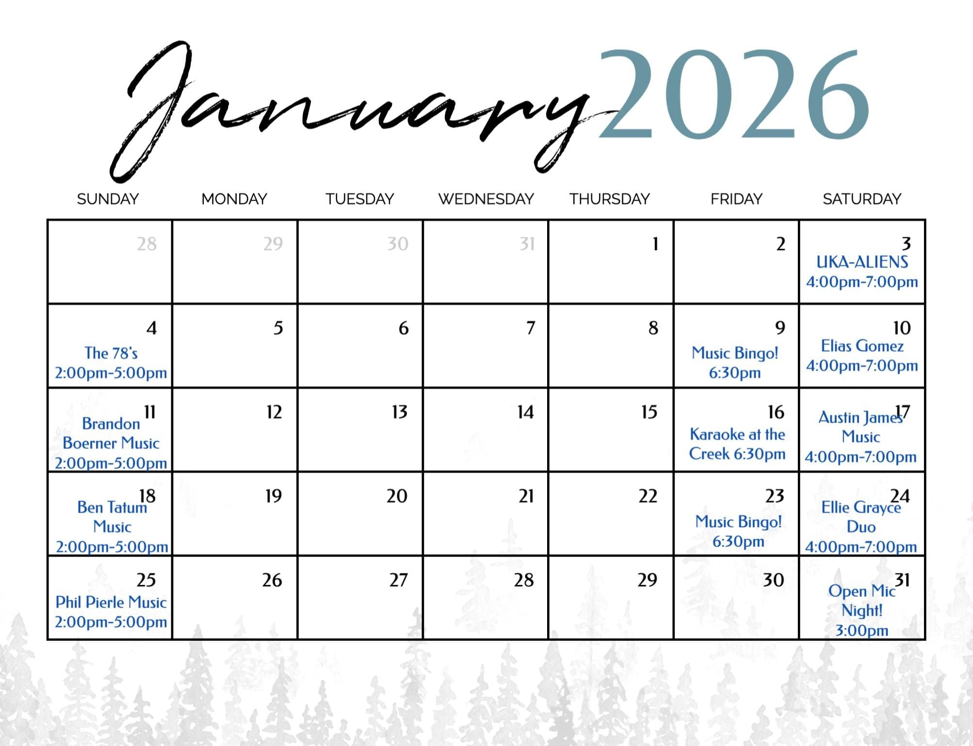 January events at Cedar Creek Martinsville include live music, karaoke, and Music Bingo
