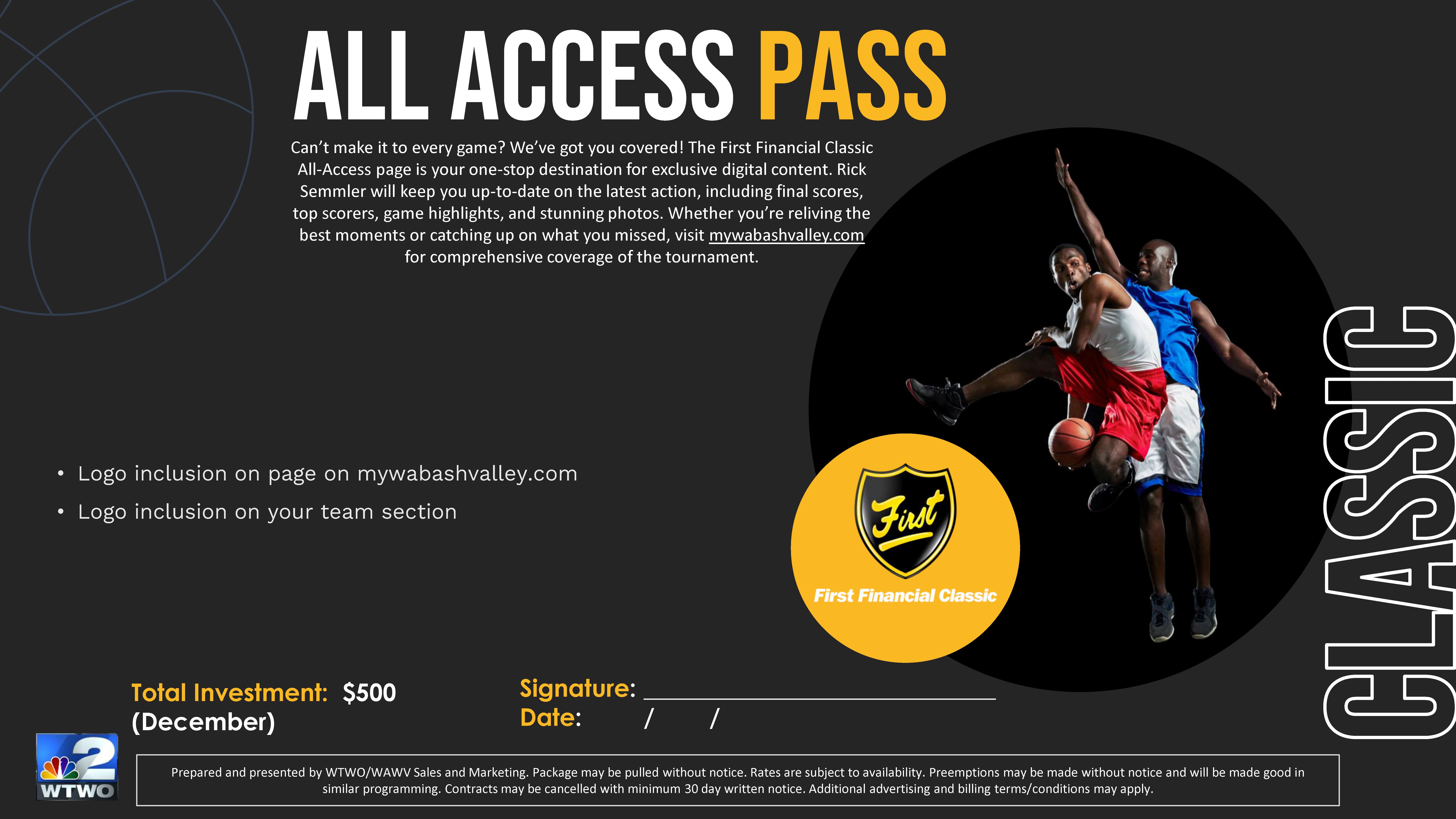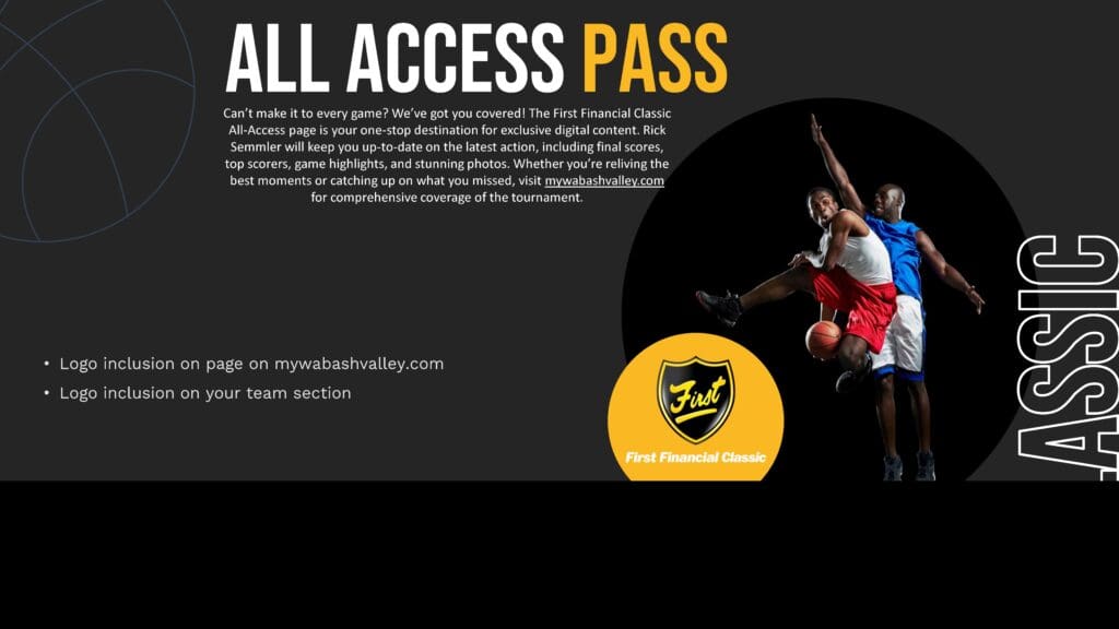 FROM RICK: Eight games over four days. This is the biggest high school boys basketball regular-season tourney in the state and is extremely popular and well known statewide. While it draws big crowds, it’s also during the holiday season, so not everyone can make it. Last year, Rick started a First Financial Classic All-Access page. This page is for fans to check out the tourney and all the games. I have game recaps for each team, leading scorers, pictures, and videos, etc. We try to get a sponsor for each team. The sponsor logo would appear on the All-Access page with their team. Here’s a link to last year’s All-Access page so you can have an idea: https://www.mywabashvalley.com/first-financial-classic-all-access-pass