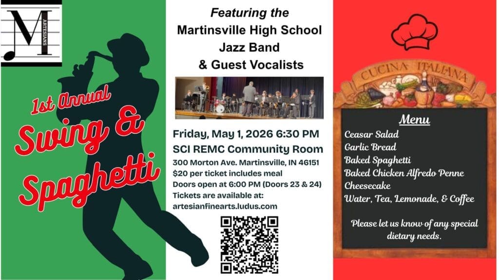 The Martinsville HS Jazz Band is looking forward to their 1st Annual Swing & Spaghetti Dinner Concert on Friday, May 1, 2026, at the SCI REMC Community Room. Doors open at 6 PM, with dinner and music starting at 6:30 PM. Tickets for reserved seating are $20, which includes the meal, and are available at artesianfinearts.ludus.com. Questions can be directed to ken.belt@msdmartinsville.org. Enjoy great music and great food, all while supporting the Martinsville HS Band program. See you on May 1st!