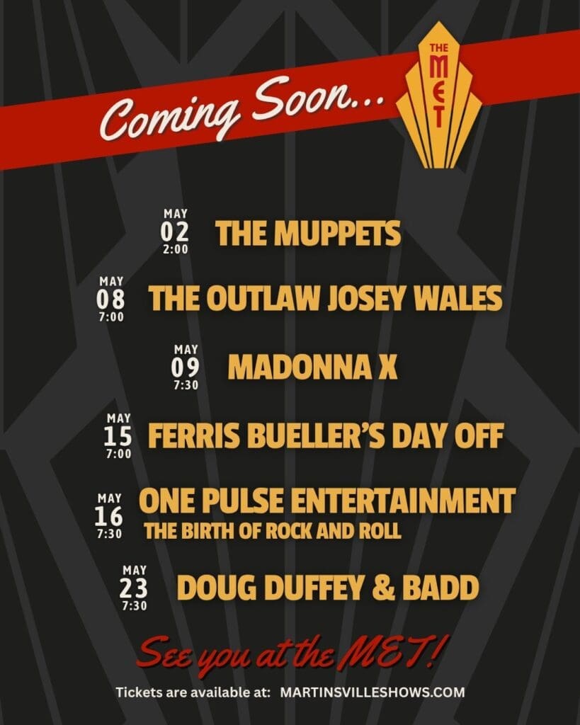 Coming to THE MET in May… Check it out! Apr 22, 2026 ✨️ Coming soon to The MET near you!✨️🎬📽🎶🎸🎼🎟A perfect balance of date nights or family time! We have something for everyone! Tickets are available at MartinsvilleShows.com