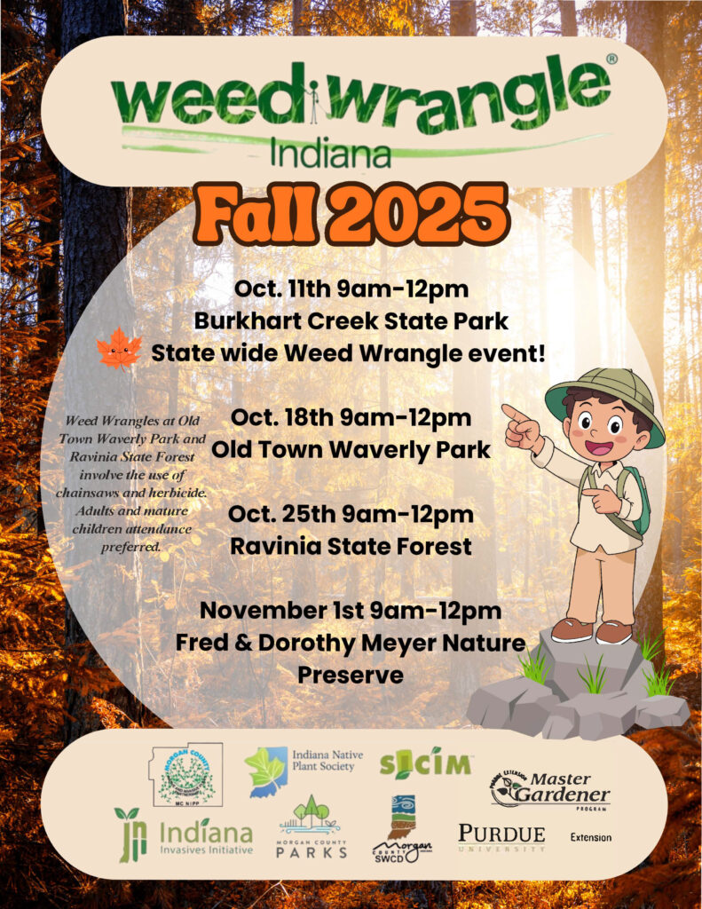 Join the Morgan County Native and Invasive Plant Partnership at Ravinia State Forest this Saturday, October 25, 2025 from 9:00 am to Noon for a Weed Wrangle! We will meet in the parking lot with the Ravinia State Forest Sign, located across the road from Burkhart Creek Park. (See the map and Google Maps link below)